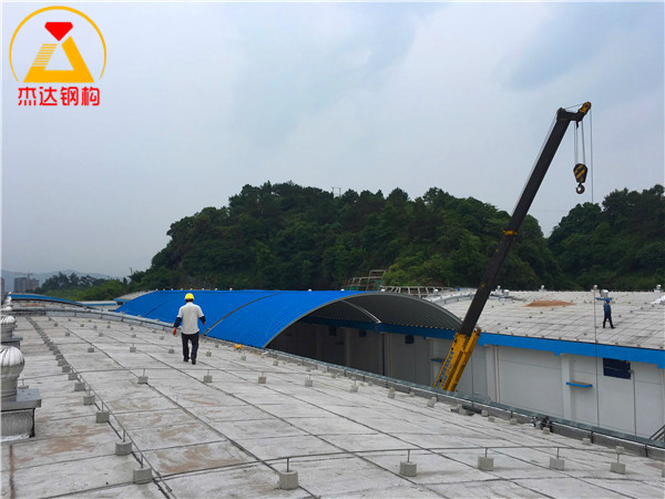 托板部分采用優(yōu)質(zhì)鋼材,經(jīng)過精密焊接工藝組裝,保證連接處的強度與耐久性。拱形屋頂?shù)脑O計不僅提升了建筑的整體美觀性,同時也增強了屋面的排水能力和抗風性能。