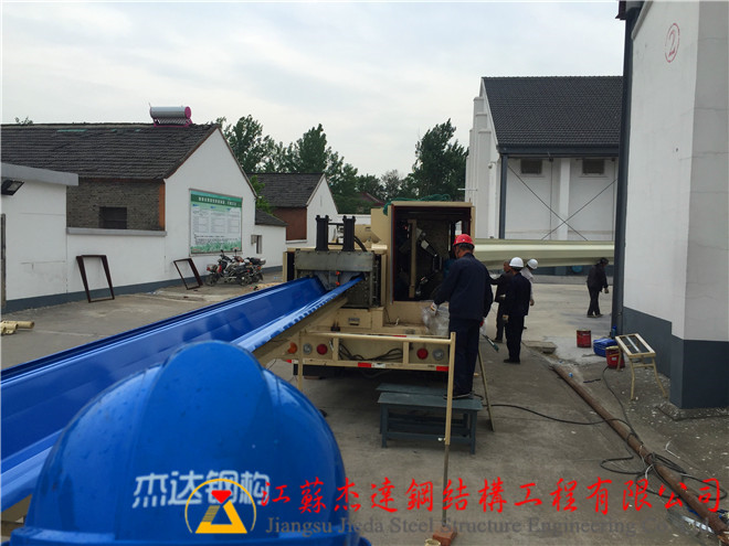本工程罩棚整體跨度達18.9米,長度54.65米,總覆蓋面積超過一千平方米。棚頂結構使用了厚度為0.9mm的彩涂卷材料,選用品牌為南通輝煌TS280GD-Z系列,顏色為海藍色,不僅外觀協調,還具備優良的防腐蝕性能。