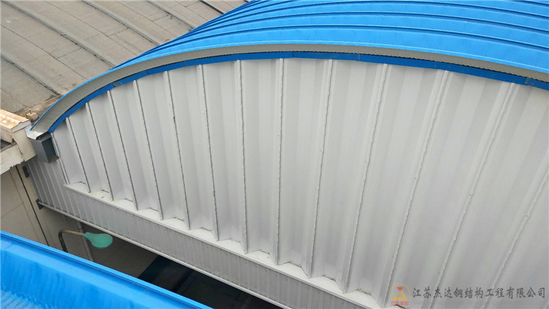 施工方面,江蘇杰達(dá)鋼結(jié)構(gòu)工程有限公司施工團(tuán)隊(duì)嚴(yán)格依照設(shè)計(jì)方案展開作業(yè)。現(xiàn)場(chǎng)照片顯示,彩涂卷板瓦片已完成生產(chǎn),屋頂組裝工作正有序進(jìn)行,部分拱形屋頂結(jié)構(gòu)清晰可見,施工進(jìn)展順利。