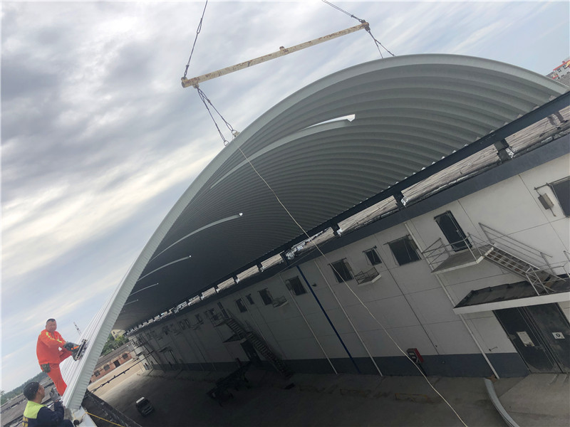 本項目建設的是一棟跨度為16米、長度120米的拱形屋頂倉間罩棚,總建筑面積達到1920平方米。屋頂選用了臺灣尚興0.9mm TS280GD-Z高強彩涂卷,整體顏色為白色,外觀整潔大方,具備良好的耐腐蝕性能。