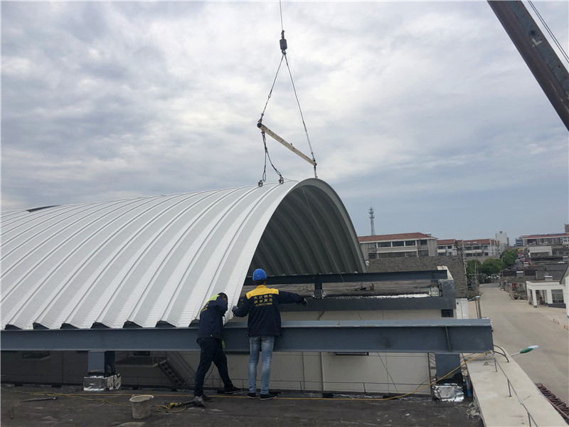 在拱形屋頂安裝完畢后,項目進入山墻桁架吊裝階段。桁架將作為山墻固定的主要支撐框架,后續完成封裝后將進一步提升整體密閉性。