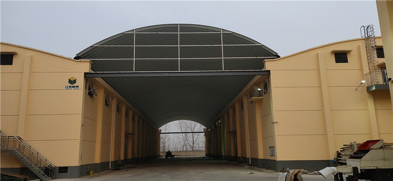 本工程位于江蘇省連云港和茂糧庫內,罩棚結構為拱形屋頂形式,整體跨度約18米,長度80米,采用的屋面板材為海藍色,厚度為1.2mm,材料為TS280GD-Z鍍鋅鋼板,具備良好的防腐與承重性能。