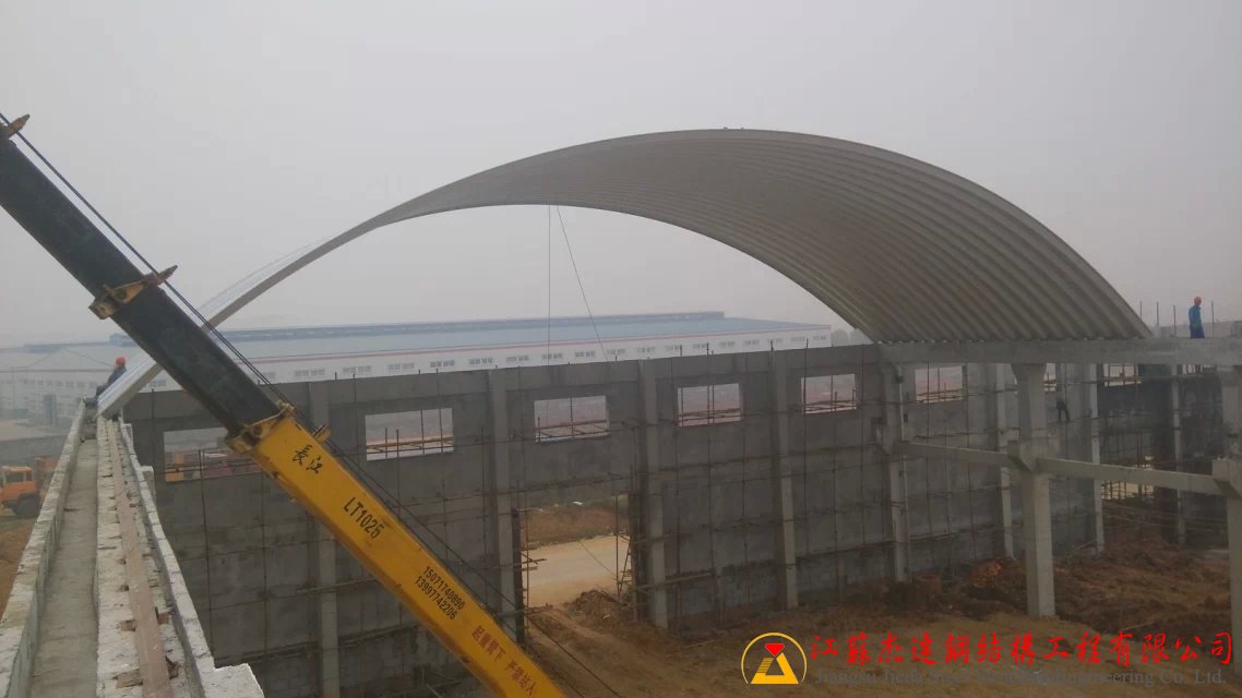 本次拱形屋頂工程施工面積達(dá)8萬多平方米,施工單位江蘇杰達(dá)鋼結(jié)構(gòu)工程有限公司憑借豐富的鋼結(jié)構(gòu)施工經(jīng)驗(yàn),采用科學(xué)施工方案,確保項(xiàng)目質(zhì)量和進(jìn)度。施工中嚴(yán)格執(zhí)行安全管理制度,加強(qiáng)現(xiàn)場監(jiān)控,保障施工安全無事故。